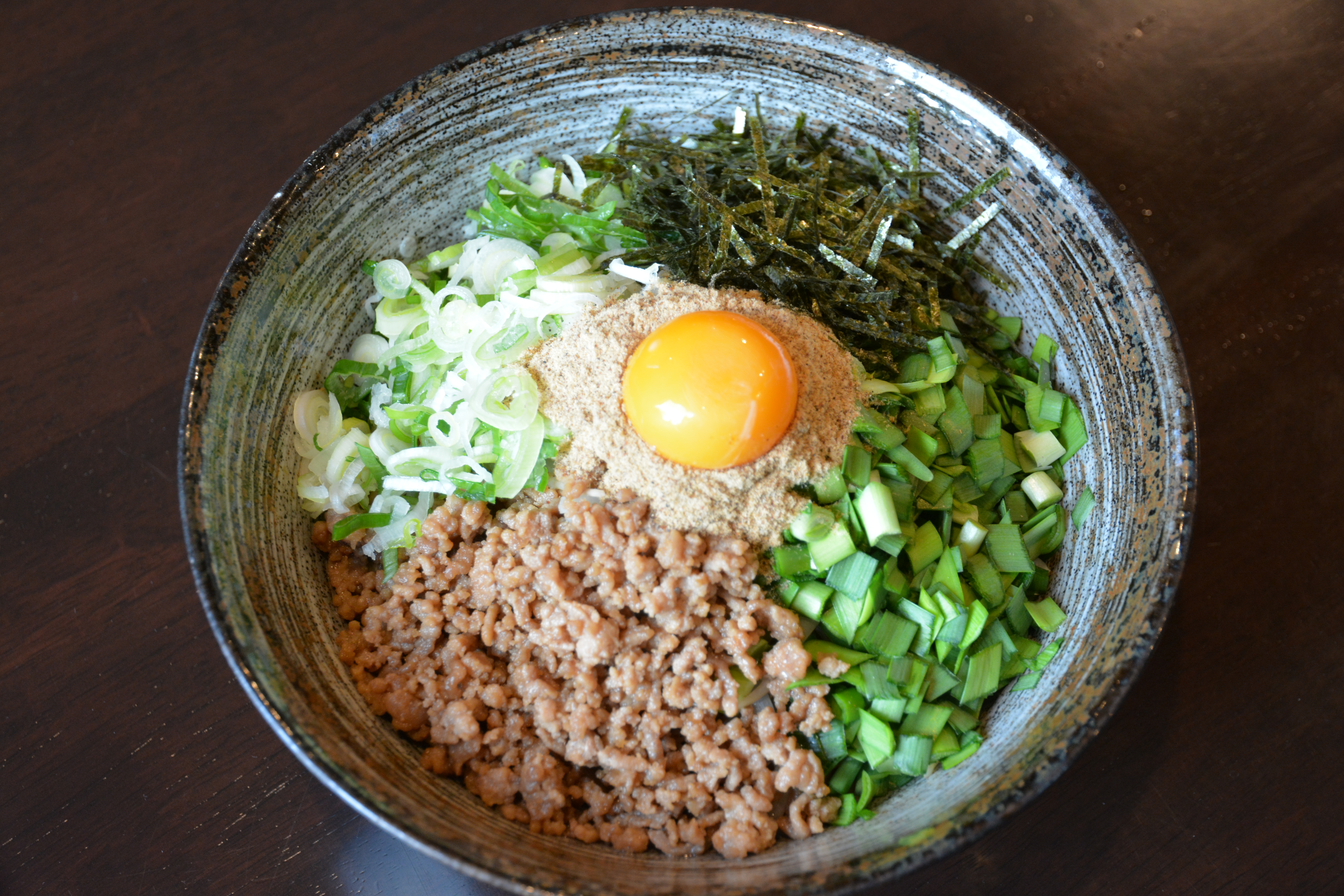 特製たれを絡めた210グラムの中太麺と、もやし・味付挽肉・ニラ・刻み海苔・刻みねぎときて、